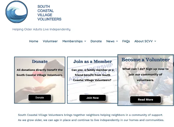 On southcoastalvillagevolunteers.org, three new highlighted links—Donate, Join as a Member, and Become a Volunteer—make the site easy to use for new viewers. The page also presents important information about current and upcoming events, news, and other key stories from the SCVV newsletter. One click will take you to any post of interest.